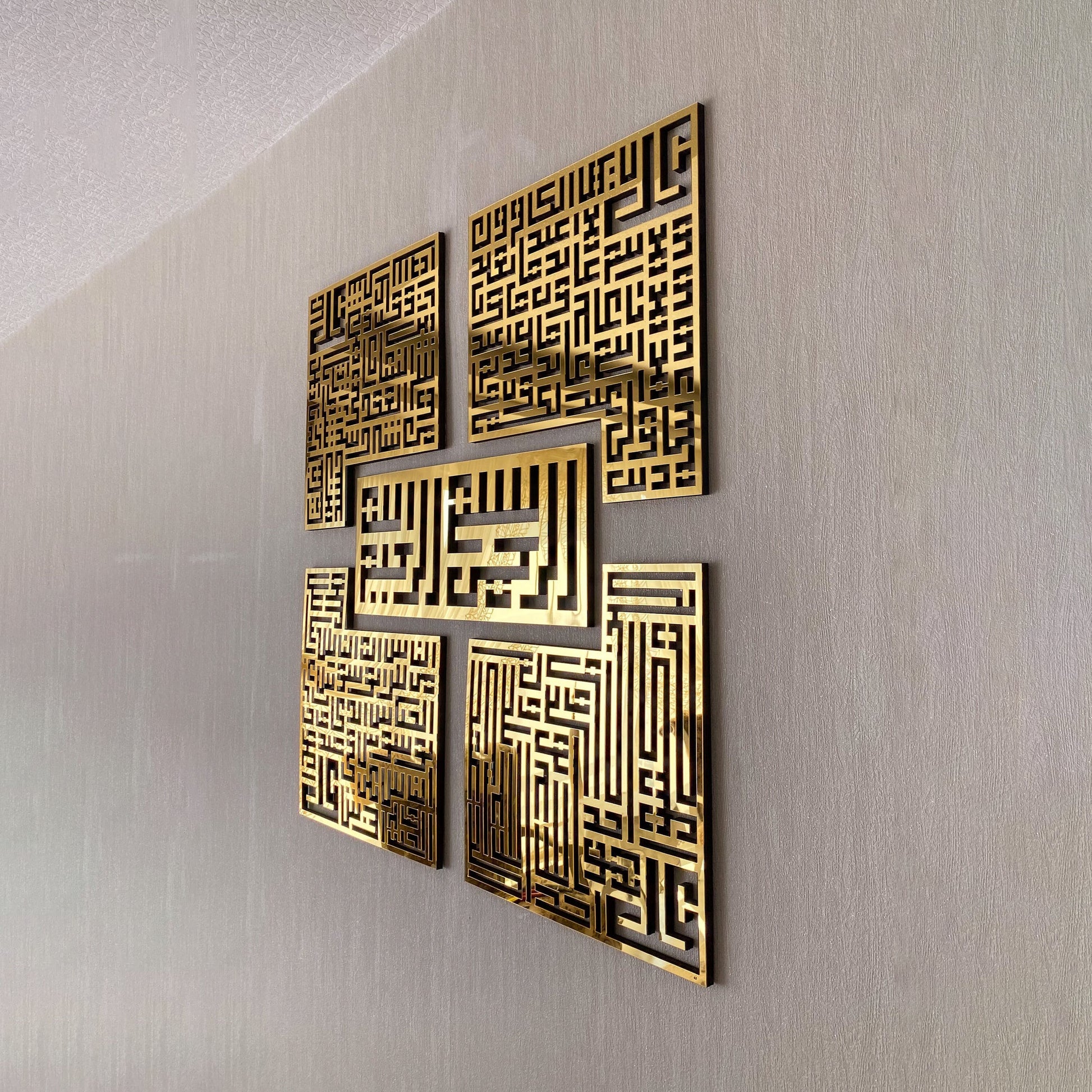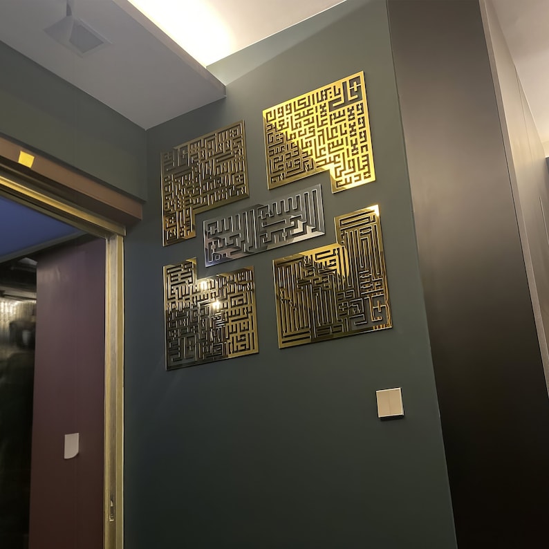 ال لوحة جدارية إسلامية من الأكريليك، أربعة قولس كوفي بسم الله يمزج بين آيات قرآنية مقدسة وخطوط كوفية جريئة وحديثة ✨ - تعبير معاصر عن الإيمان مثالي لإضفاء لمسة جمالية على أي مساحة معيشة أو مكان للصلاة.