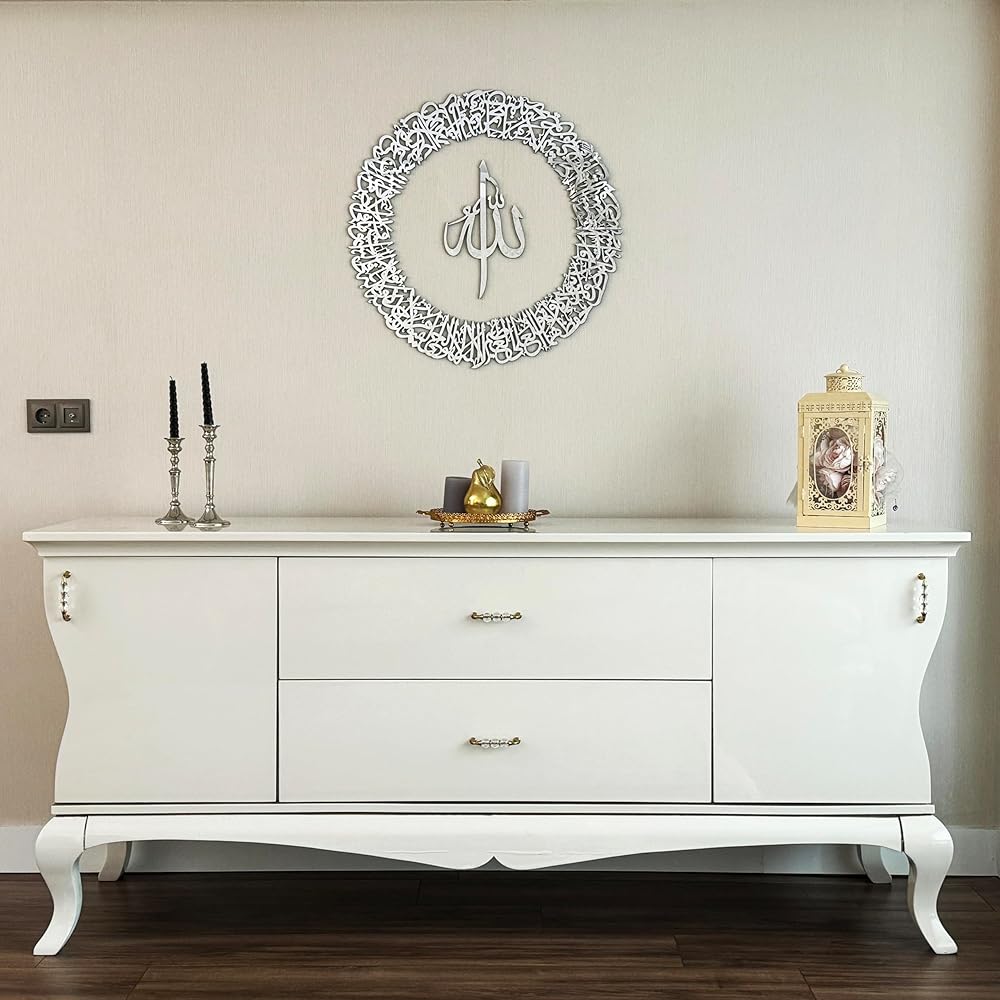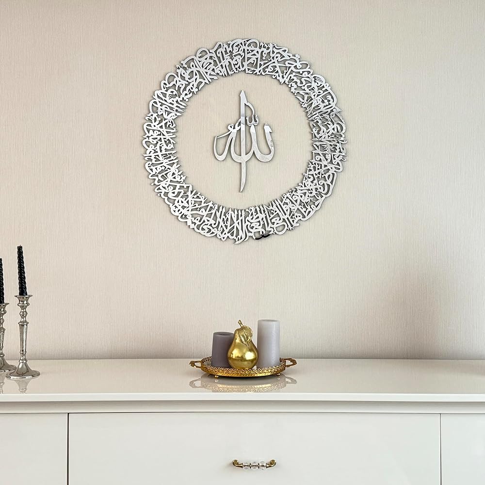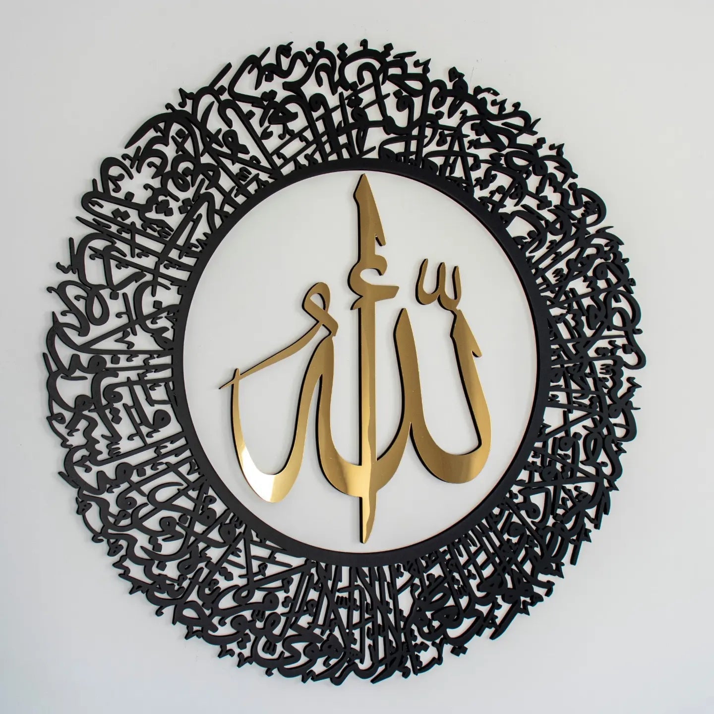 تتميز لوحة الحائط الأكريليكية المصقولة اللامعة "آية الكرسي" بتصميم ثلاثي الأبعاد لامع باللون الأسود أو الذهبي أو الفضي، مما يوفر قطعة مركزية أنيقة وراقية لأي منزل عصري 🏡✨.