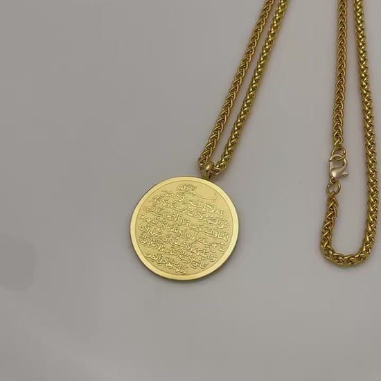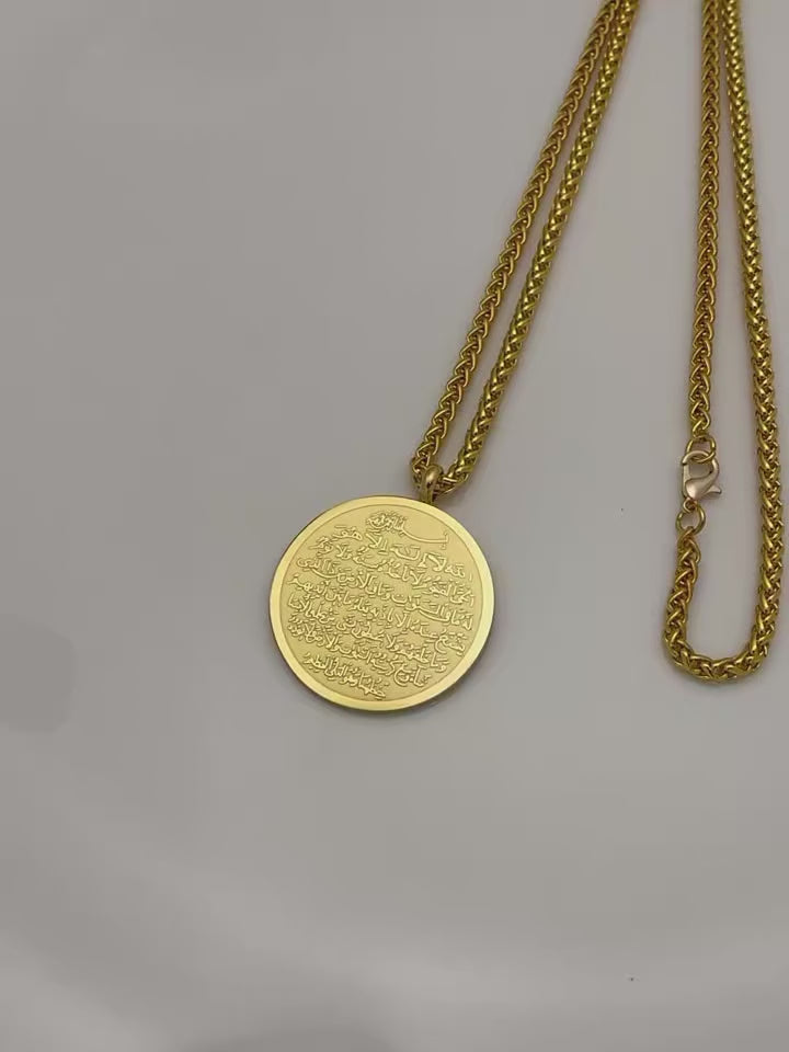Islamic Ayat al-Kursi Pendant Necklace – A beautifully crafted round gold-tone pendant engraved with the full Ayat al-Kursi (Verse 255 from Surah Al-Baqarah), symbolizing protection and divine blessings in Islamic tradition.