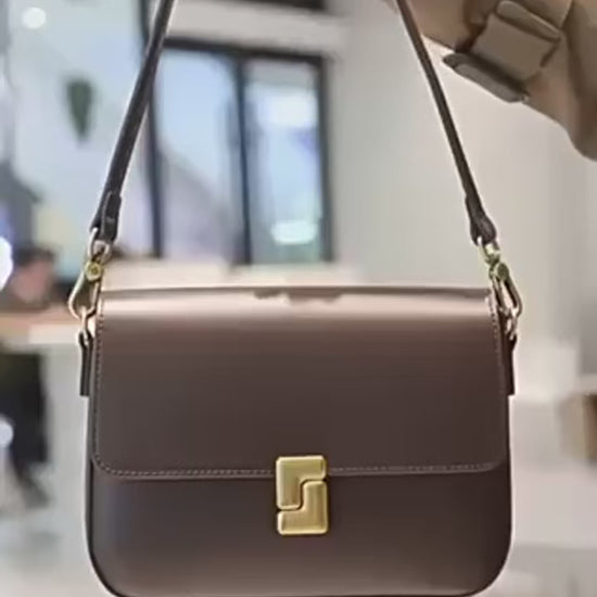 Structured Crossbody Handbag– A sophisticated crossbody handbag combining rich textures with a bold gold-tone geometric clasp.